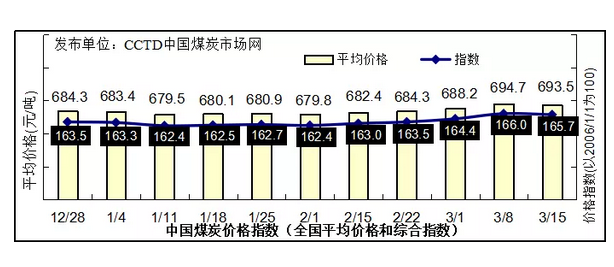 本期中国煤炭价格指数小幅回落。根据监测数据测算,3月15日,中国煤炭价格指数(全国综合指数)为165.7点,比上期下降0.3点。