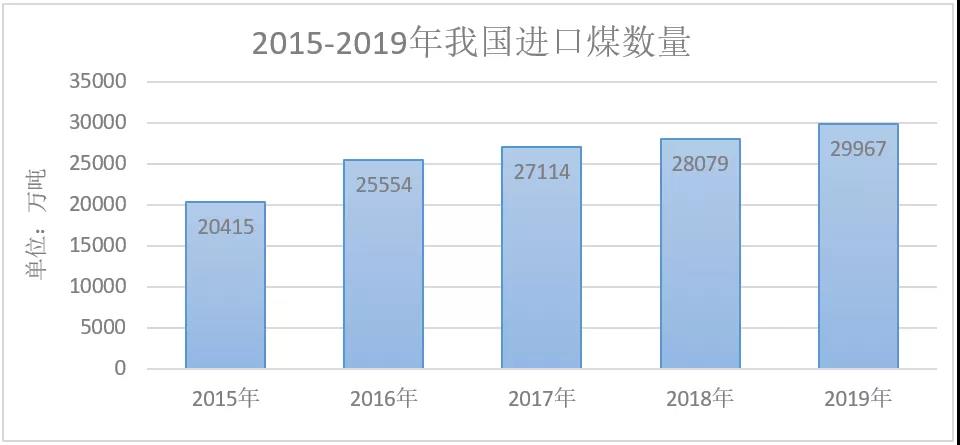 近年来,国内进口煤数据逐年上升。国家统计局公报数据显示,我国煤炭进口从2015年20415万吨,逐年稳步上升至2019年的29967万吨,增幅达46%。2019年全国原煤产量完成39.7亿吨,同比增长4.0%,而进口煤同比增长6.3%,进口煤增速高于国内煤产量。